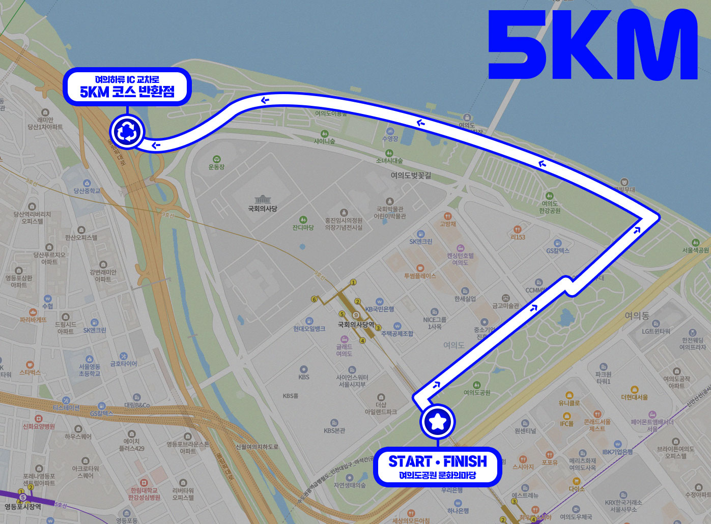 * 5km 코스 : 여의도공원 문화의마당 - 물빛무대 앞 광장 - 여의도 한강공원 - 여의도 이용숲 - 여의하류 ic 교차로 가기전(반환)