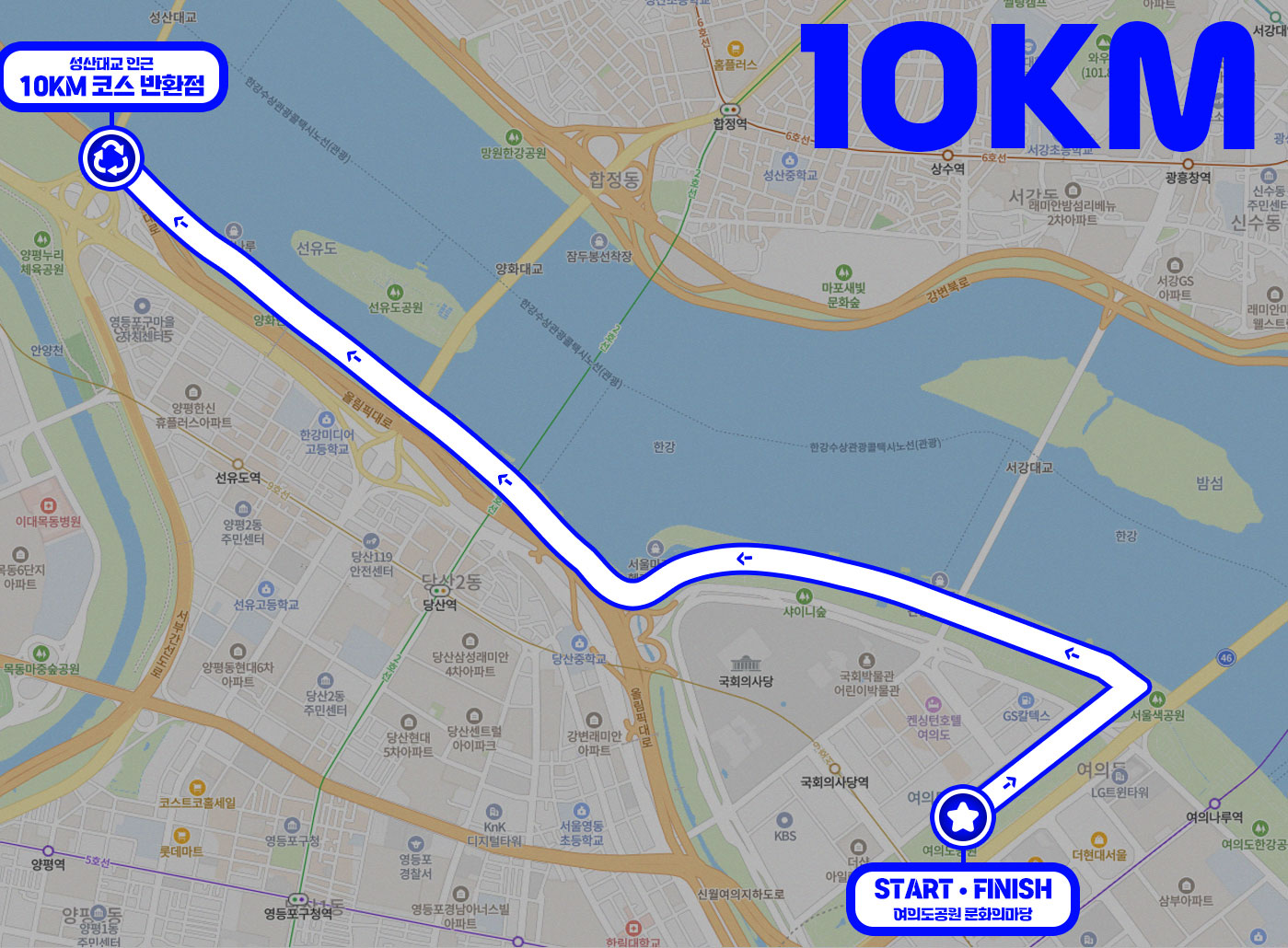* 10km 코스 : 여의도공원 문화의마당 - 물빛무대 앞 광장 - 여의도 한강 공원 - 여의도 이용숲 - 여의하류 IC 교차로 - 성산대교 인근 (반환)