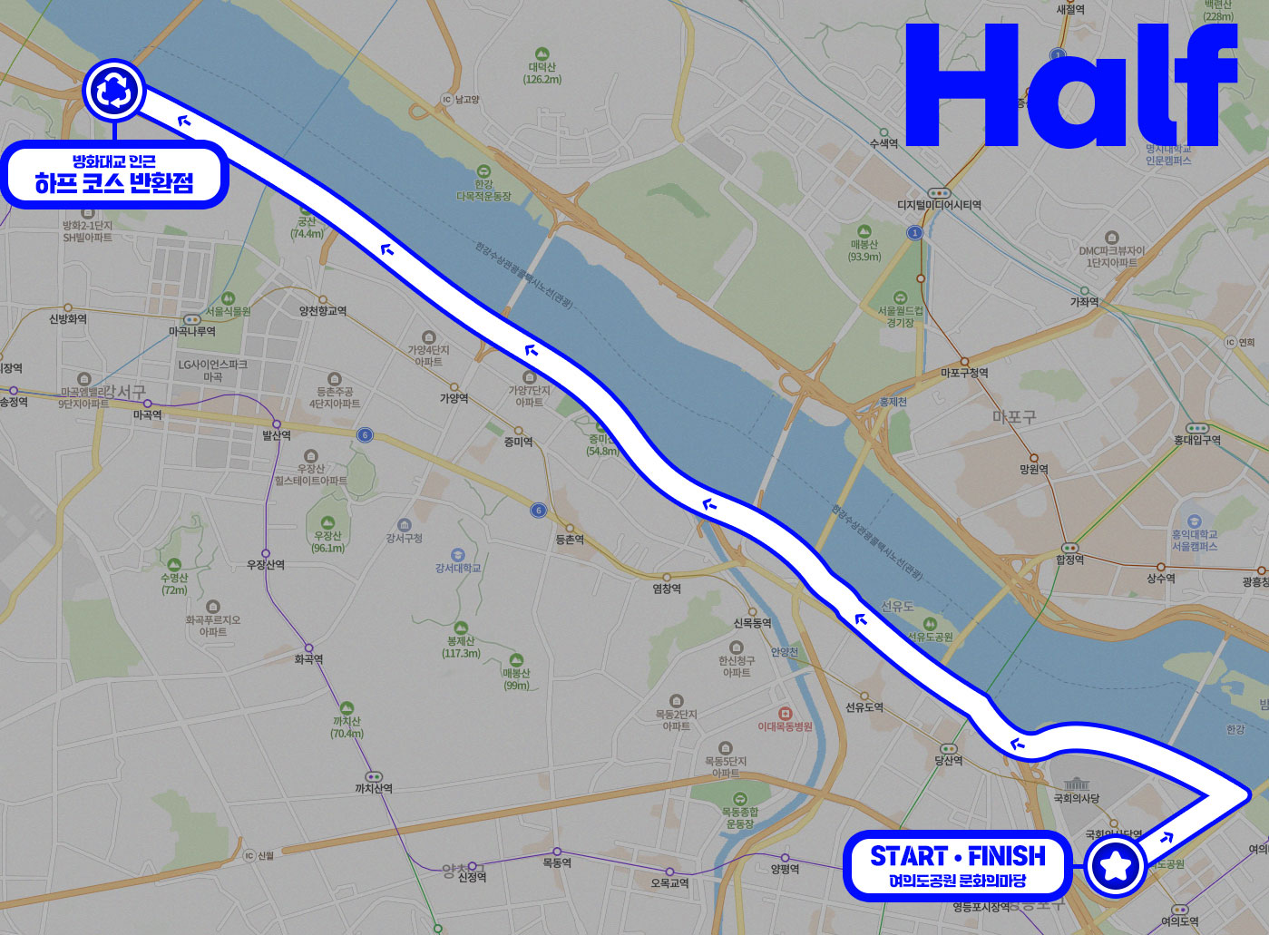 * 하프 코스 : 여의도공원 문화의마당 - 물빛무대 앞 광장 - 여의도 한강공원 -여의도 이용숲 - 여의하류 IC 교차로 - 성산대교 - 방화대교 인근 (반환)
